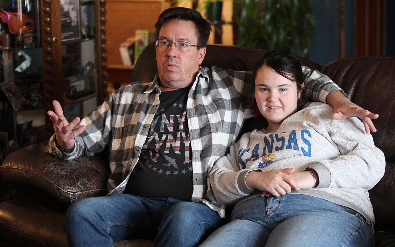 Rick Elskamp sits with his oldest daughter, Sheridan, at the Elskamp family’s home outside Topeka on January 27, 2024, and talks about his frustrations with his 23-year-old daughter being on a long waiting list for services for the mentally disabled. . , thousands of residents with disabilities in Kansas and hundreds of thousands across the United States are on waiting lists for services. (AP Photo/John Hannah)