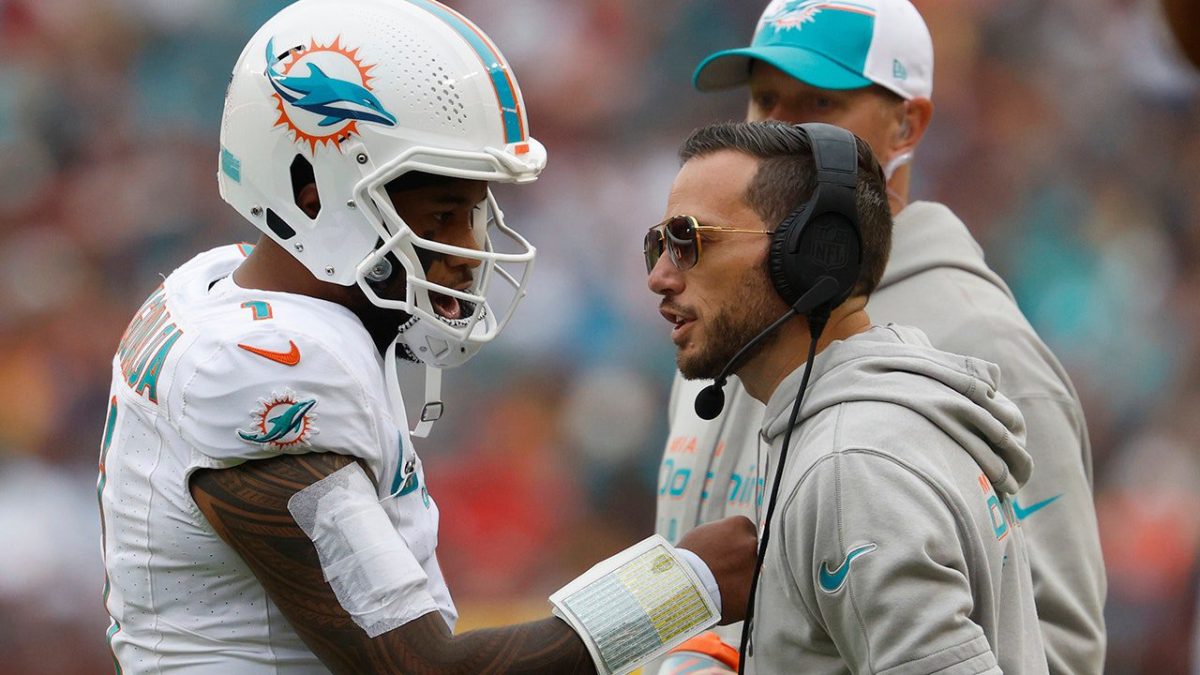Miami Dolphins quarterback Tua Tagovailoa (1) talks with Dolphins head coach Mike McDaniel during a timeout against the Washington Commanders at FedExField on Dec. 3, 2023 in Landover, Maryland. (Jeff Burke/USA Today Sports)