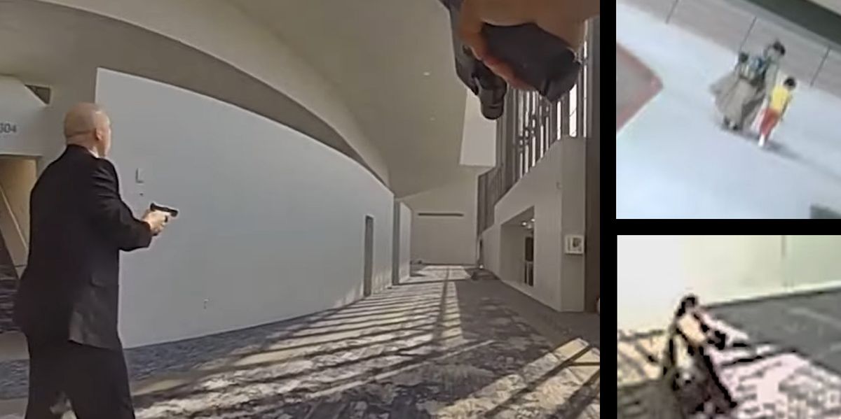 The video shows TABC police officer Adrian Herrera, who was working as a security guard at the church at the time, drawing a handgun and approaching the gunman from behind with at least three other people in tow.