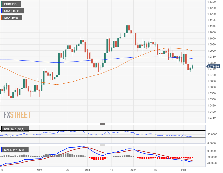 EUR/USD continues to trade south of the 1.0800 handle midweek, with the pair capped below the 200 hourly simple moving average (SMA) after being rejected from the 1.0900 area last week.