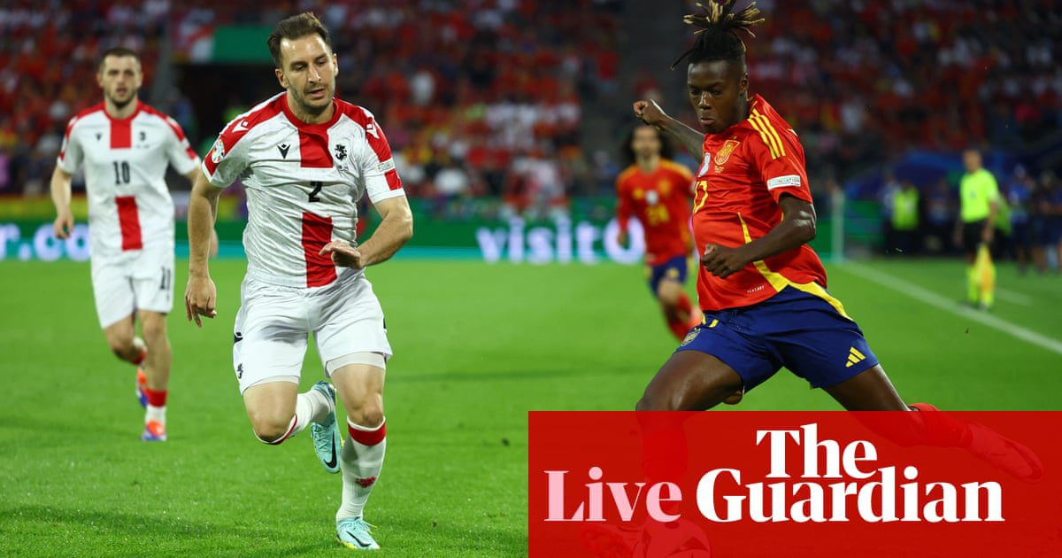 “,”elementId”:”3227c789-17ea-41ea-8464-78c15bd11009″}],”attributes”:{“pinned”:false,”keyEvent”:true,”summary”:false},”blockCreatedOn”:1719773712000,”blockCreatedOnDisplay”:”14.55 EDT”,”blockLastUpdated”:1719774059000,”blockLastUpdatedDisplay”:”15.00 EDT”,”blockFirstPublished”:1719774059000,”blockFirstPublishedDisplay”:”15.00 EDT”,”blockFirstPublishedDisplayNoTimezone”:”15.00″,”title”:”Kickoff! Spain 0-0 Georgia”,”contributors”:[],”primaryDateLine”:”Sunday, June 30, 2024 15:20 EDT”,”secondaryDateLine”:”First Published Sunday, June 30, 2024 13:30 EDT”},{“id”:”667e92138f086bfb3f8f000a”,”elements”:[{“_type”:”model.dotcomrendering.pageElements.TextBlockElement”,”html”:”