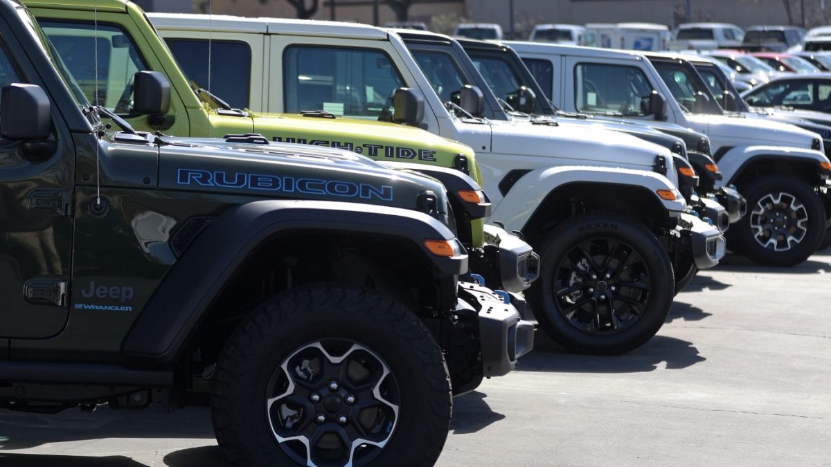 The Jeep Wrangler 4XE Plugin Hybrid appears in the sale lot at Hilltop Chrysler Jeep Dodge Ram in Richmond, California.