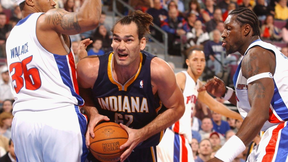 Scott Pollard of the Indiana Pacers walks to the basket surrounding Rasheed Wallace of the Detroit Pistons at the Palace of Auburn Hills on February 23, 2006 in Auburn Hills, Michigan. (Allen Einstein/NBAE via Getty Images)