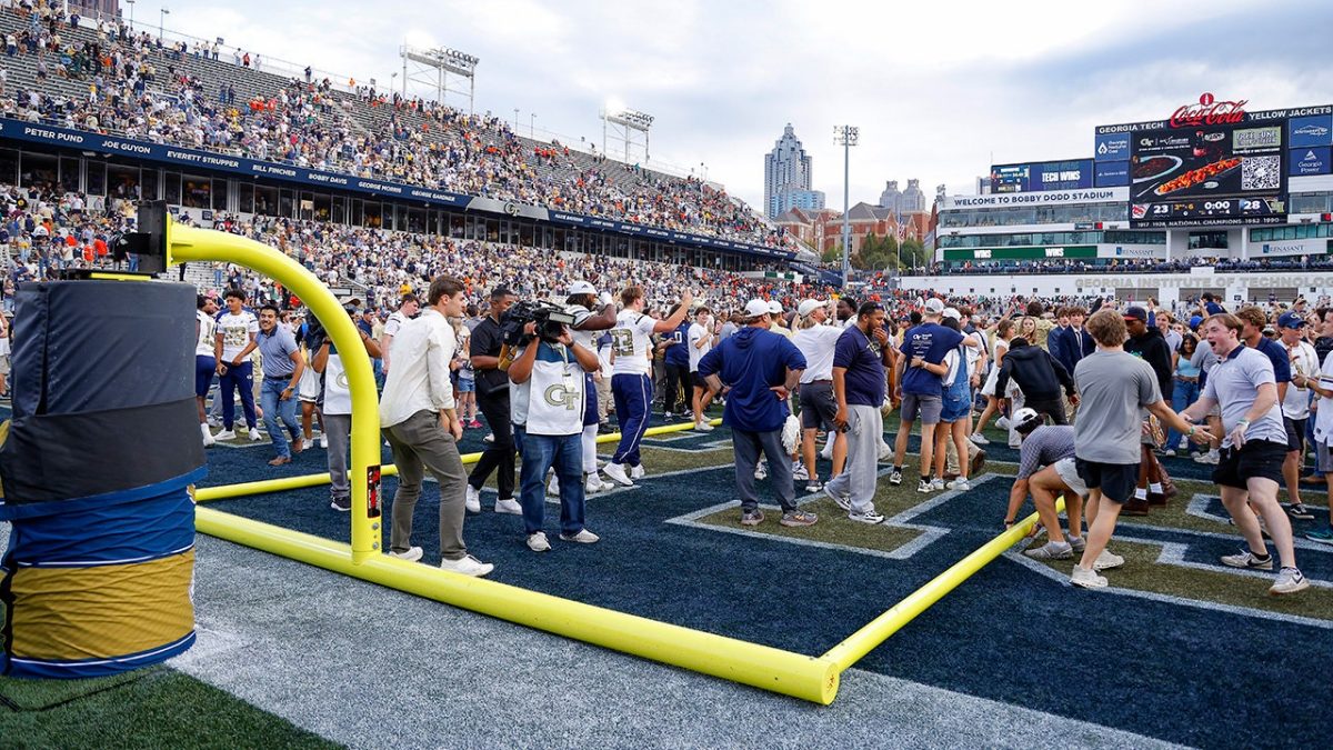 Shortly after game time reached zero, fans and students stormed the field at Bobby Dodd Stadium and knocked down both field goal posts.