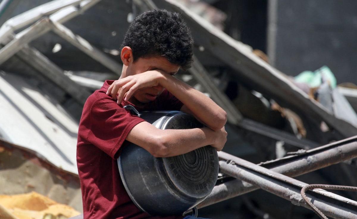 In Gaza, a father named Mahmoud Alho and a group of other parents crowd around a soup kitchen, frantically pushing forward. Among them are small children, some crying. One little boy raises a plastic basin, hoping to catch the attention of the person serving soup. He wriggles into the crowd until he finally receives his share.