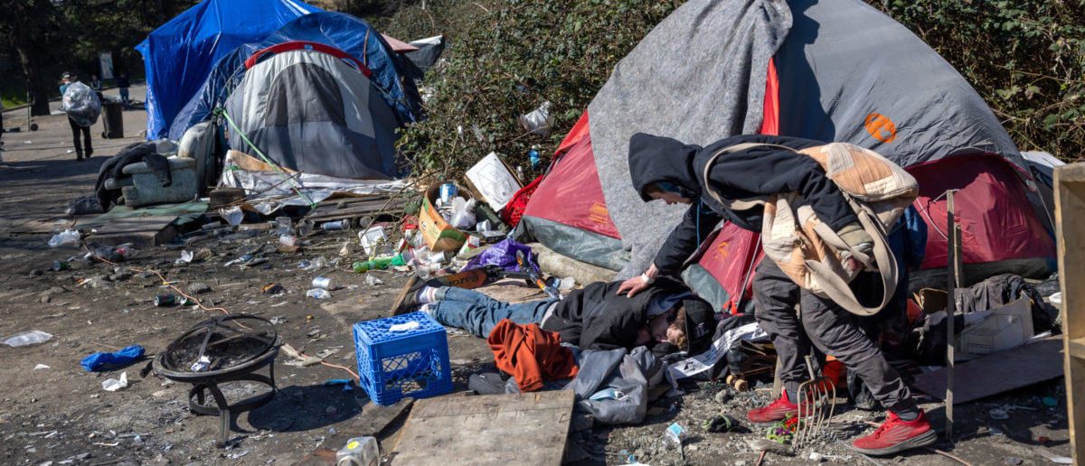 People sleeping outdoors on a sidewalk in Seattle, Washington. (Photo by Karen Ducey/Getty Images)