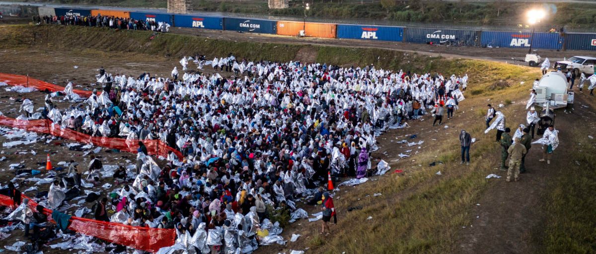 EAGLE PASS, Texas – SEPTEMBER 30: Asylum seekers who crossed the Rio Grande River from Mexico into the United States wait to be processed by the U.S. Border Patrol on September 30, 2023 in Eagle Pass, Texas. . (Photo by John Moore/Getty Images)