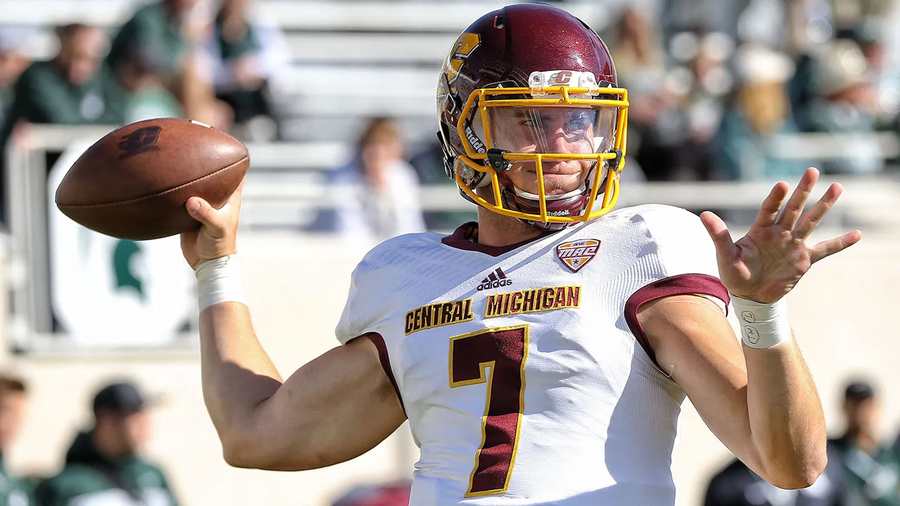 Central Michigan Chippewas quarterback Tommy Lazzaro, 7, warms up before a game against the Michigan State Spartans on September 29, 2018 at Spartan Stadium. (Mike Carter-USA Today Sports)