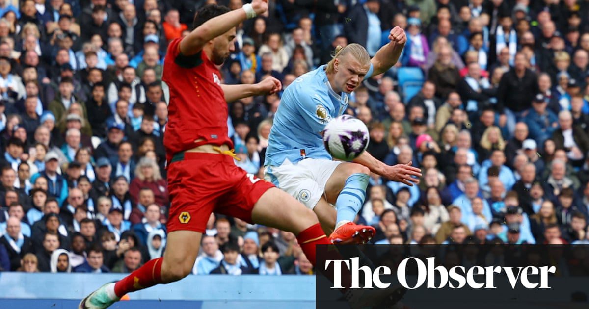 With Wolves already cowering, City turned things around in the 12th minute as Guardiola made his way to the posh seats and clenched his fists. In a blue blur, the next attack ended with De Bruyne firing wide, Haaland’s header forcing Sa to make a diving save and Max Kilman’s low block denying Foden.