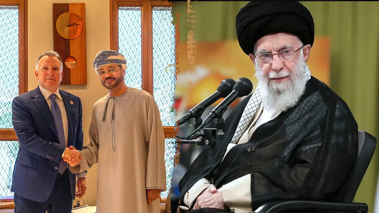 US Special Envoy to the Middle East Steve Witkov will shake hands with Oman Foreign Minister Sayyid Badr Albusady in Muscat, Oman on April 12, 2025. (Distribution materials via Omani Communications Agency/Reuters)