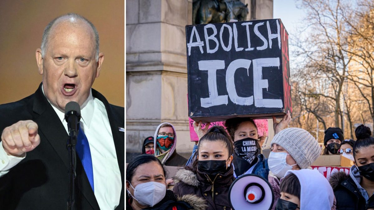 The split reveals former acting ICE Director Tom Homan and anti-ICE protesters ((Eric McGregor/LightRocket via Getty Images; Andrew Caballero Reynolds/AFP via Getty Images))