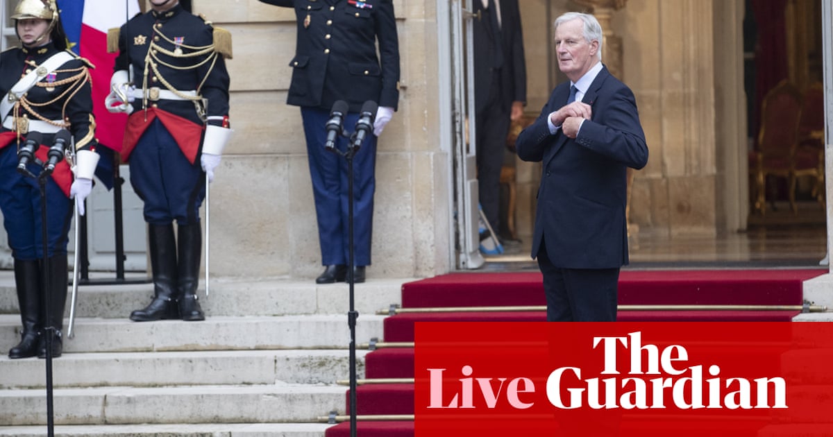 “,”elementId”:”5742df60-220f-47a6-a902-490aa27fa8d8″}],”attributes”:{“pinned”:false,”keyEvent”:true,”summary”:false},”blockCreatedOn”:1725609456000,”blockCreatedOnDisplay”:”03.57 EDT”,”blockLastUpdated”:1725609452000,”blockLastUpdatedDisplay”:”03.57 EDT”,”blockFirstPublished”:1725609456000,”blockFirstPublishedDisplay”:”03.57 EDT”,”blockFirstPublishedDisplayNoTimezone”:”03.57″,”title”:”Michel Barnier vows to address feelings of 'anger' and 'injustice' as France's new PM”,”contributors”:[{“name”:”Angelique Chrisafis”,”imageUrl”:”https://i.guim.co.uk/img/uploads/2021/04/15/Angelique_Chrisafis.jpg?width=300&quality=85&auto=format&fit=max&s=54479245beb300c56c12a6bfc8dcf2d3″,”largeImageUrl”:”https://i.guim.co.uk/img/uploads/2021/04/15/Angelique_Chrisafis.png?width=300&quality=85&auto=format&fit=max&s=8870940d40851b347cc3bd83841053db”}],”primaryDateLine”:”Friday, September 6, 2024 05:10 EDT”,”secondaryDateLine”:”First Published Friday, September 6, 2024 03:57 EDT”}],”filterKeyEvents”:false,”id”:”key-events-carousel-mobile”,”absoluteServerTimes”:false}”>