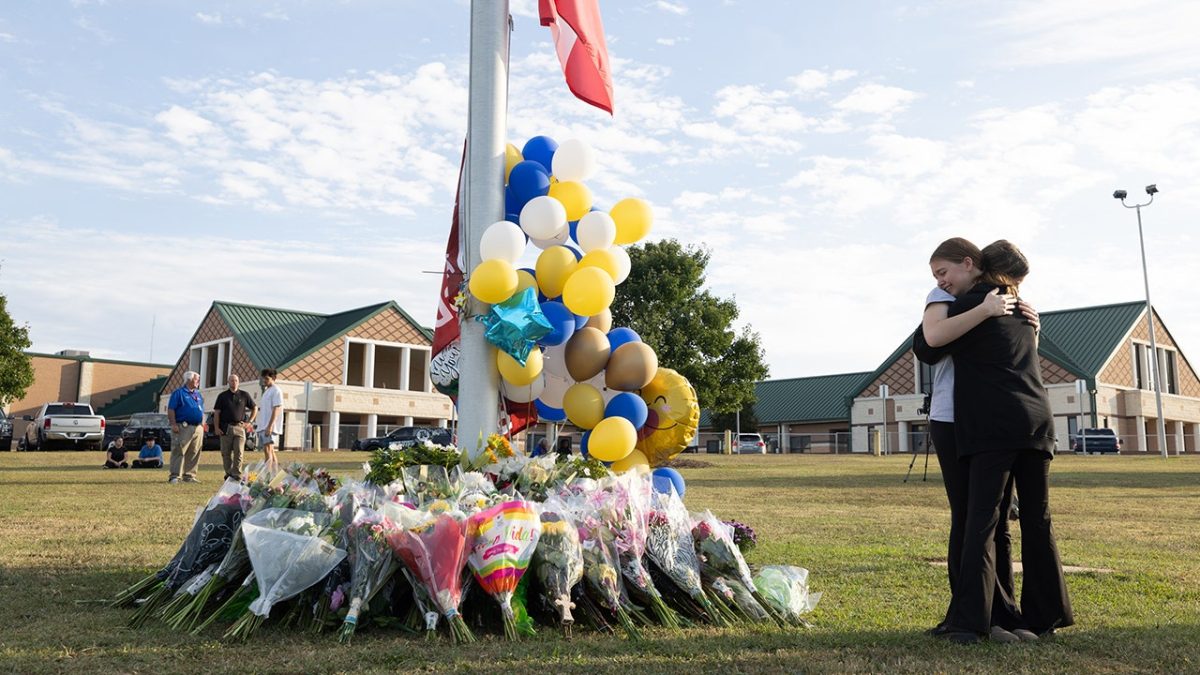 Students embrace near a makeshift memorial at Apalachee High School in Winder, Georgia. (Jessica McGowan/Getty Images)