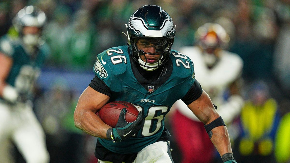 The Philadelphia Eagles run through Saquon Barkley (26) after a touchdown with Washington's manager in the second half in the NFC Championship game at Lincoln Financial Field. (Imagn image of Bill Streicher-Immagn)