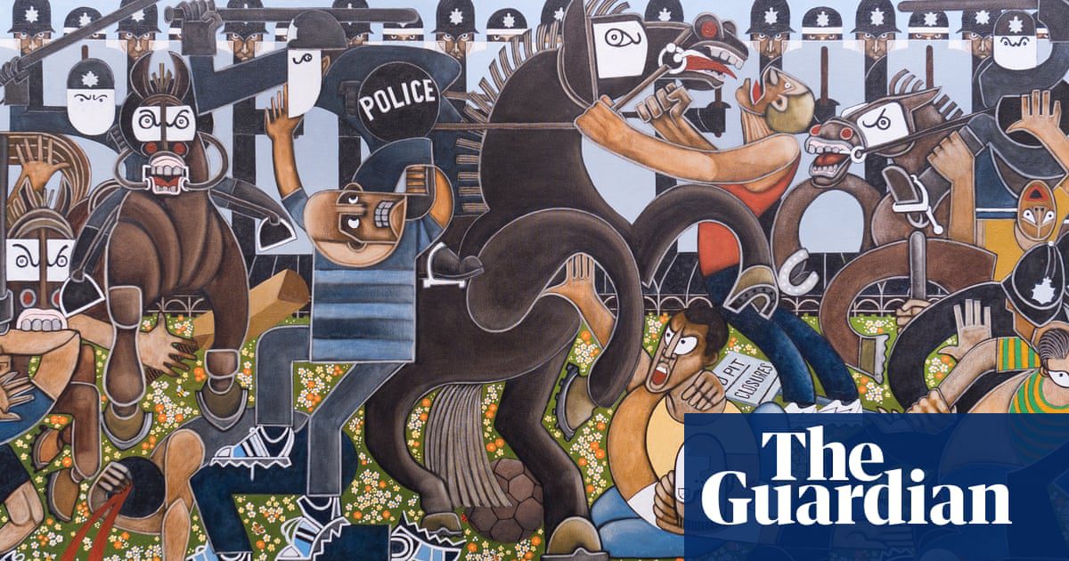The resulting painting, Orgreave After Guernica (2018), was displayed in an exhibition exploring the end of coal mining and its impact on local communities.