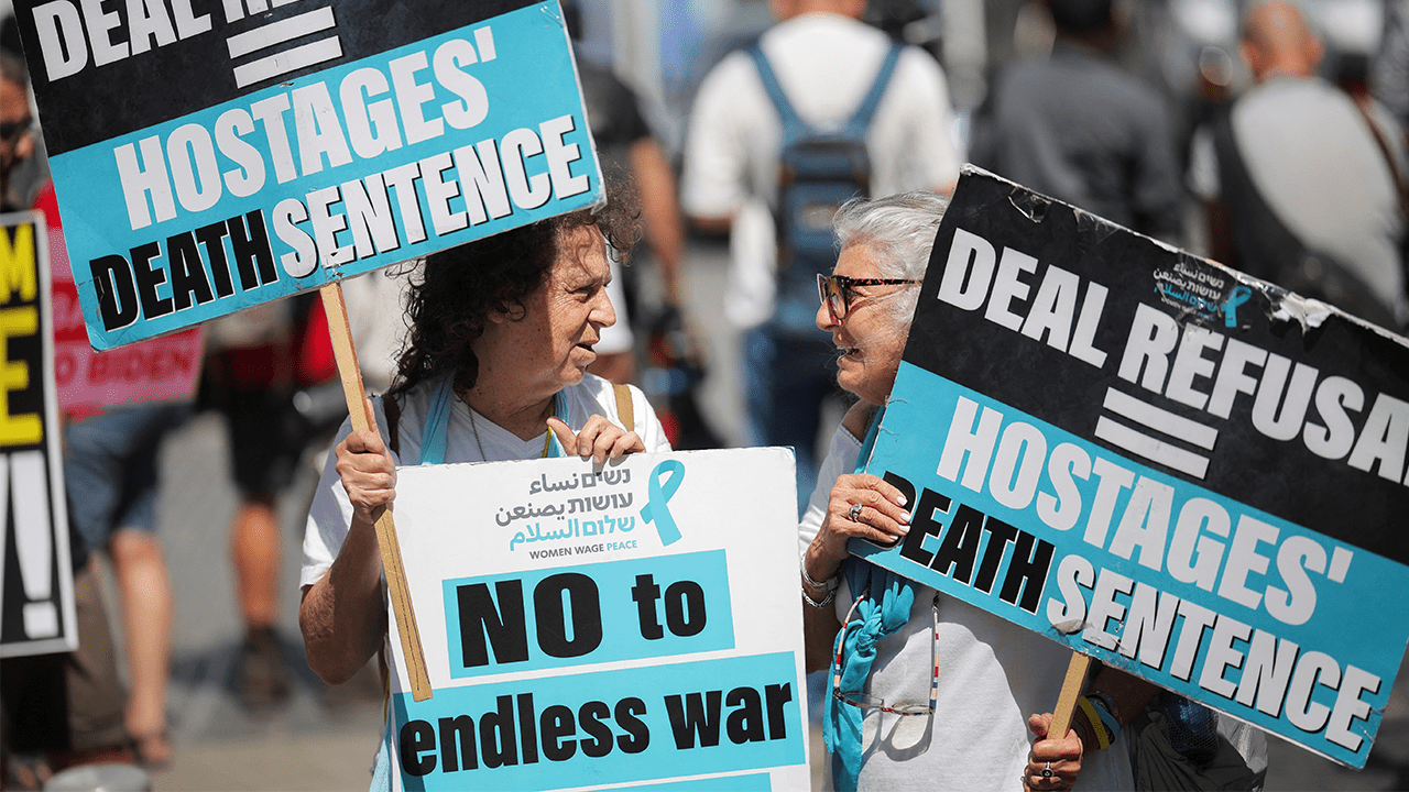 Family members and supporters protest outside a meeting also attended by U.S. Secretary of State Antony Blinken, demanding the immediate release of hostages kidnapped in a deadly Oct. 7 attack, in Tel Aviv, Israel, June 11, 2024, as the conflict in the Gaza Strip continues between Israel and Hamas. (Reuters)