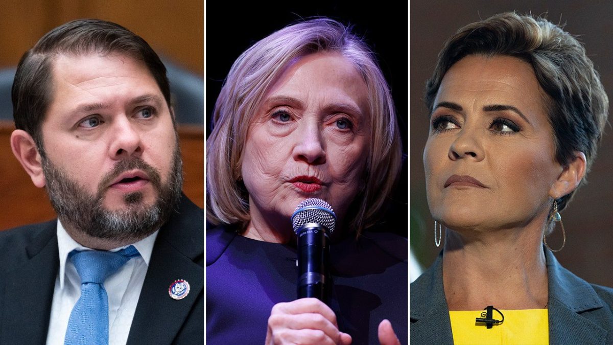 Democratic Arizona Congressman Ruben Gallego, former Secretary of State and Democratic presidential candidate Hillary Clinton, and Republican Arizona Senate candidate Kari Lake. (Getty Images)