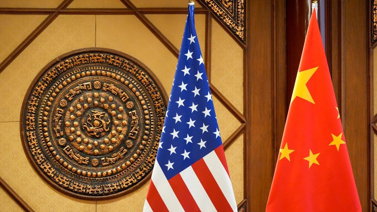 The flag is raised for a meeting between Secretary of State Antony Blinken and Chinese Minister of Public Security Wang Xiaohong in Beijing on April 26, 2024. (AP Photo/Mark Schiefelbein)