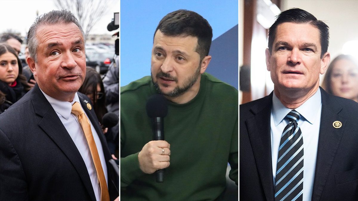 From left: Congressman Don Bacon, Ukrainian President Volodymyr Zelenskiy, Congressman Austin Scott. (Getty Images)