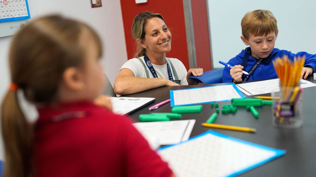 Math interventionist Jessica Foreman (center) teaches with a small group of first-grade students at A.D. Henderson School on April 16, 2024 in Boca Raton, Florida. Teachers at the K-12 public school, one of Florida’s top-performing schools, say their autonomy leads to success. (AP Photo/Rebecca Blackwell)