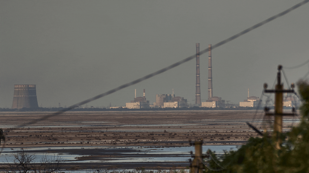 Europe’s largest nuclear power plant, the Zaporizhzhia nuclear power plant, is visible in the background of the shallow Kakhovka reservoir after a dam collapse, Tuesday, June 27, 2023, in Russian-occupied Enerkhodar, Ukraine. Officials at the Russian-controlled Zaporizhzhia nuclear power plant said: The power plant was attacked by Ukrainian military drones on Sunday, April 7, 2024, including an attack on the dome of the plant’s No. 6 generator. (AP Photo/Rivkos)