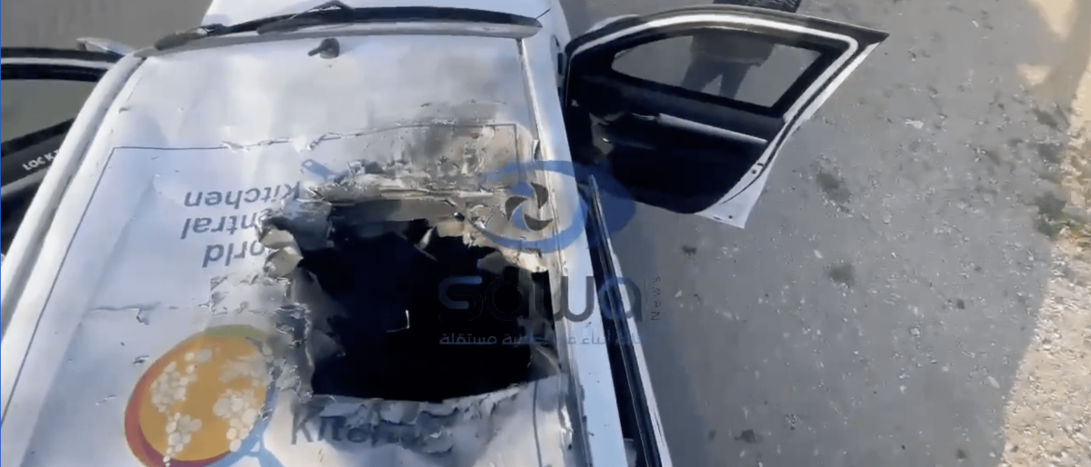 The video shows one car, with the WCK logo, with a damaged roof, indicating it was hit from the air.