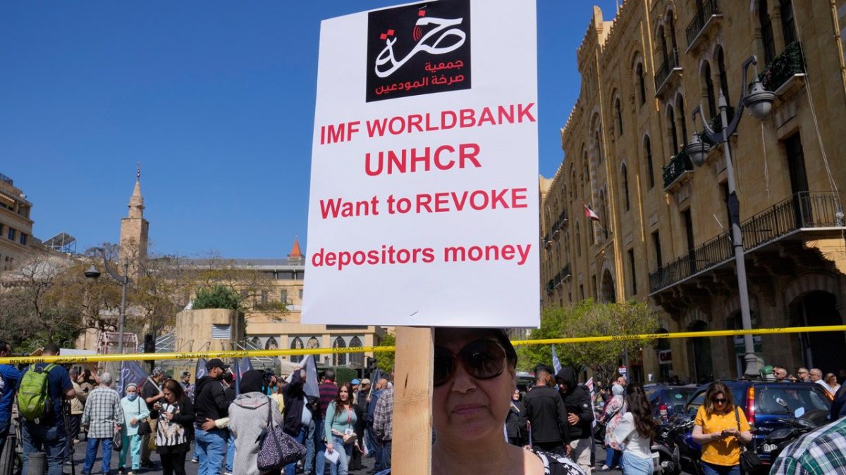 A protesting depositor holds a placard during a protest near the parliament building in downtown Beirut, Lebanon, May 9, 2023. The World Bank said Thursday, May 23, 2024, that poverty in Lebanon has tripled in the tiny Mediterranean nation’s decade-long financial crisis. (AP Photo/Hussein Mara, File)