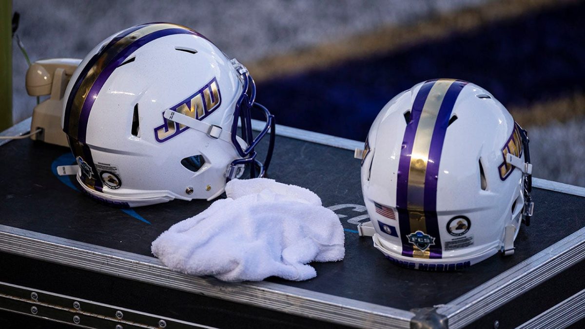 A full view of a James Madison Dukes helmet on the sideline during the first half of the NCAA Division I FCS Football Championship quarterfinal game between the James Madison Dukes and the North Dakota Fighting Hawks at Bridgeforth Stadium on May 2, 2021 in Harrisonburg, Virginia. (Scott Tetch/Getty Images)