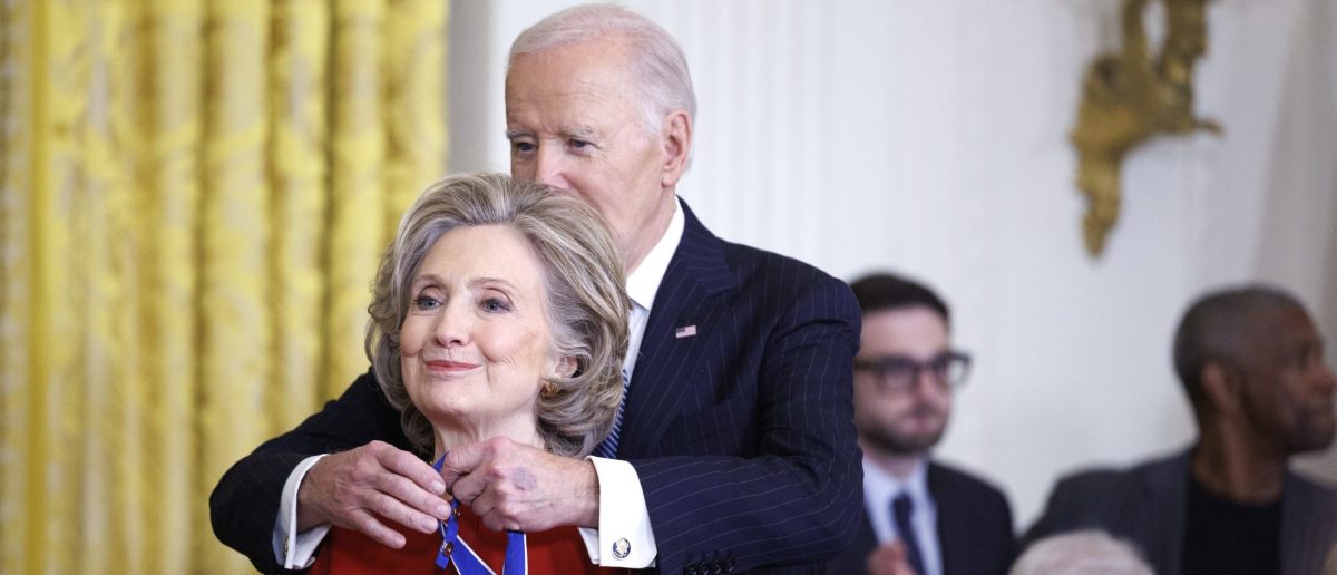 Attendees at the Presidential Medal of Freedom ceremony applaud as President Joe Biden presents the medal to former Secretary of State Hillary Rodham Clinton. January 4, 2025. Screenshot/YouTube/White House