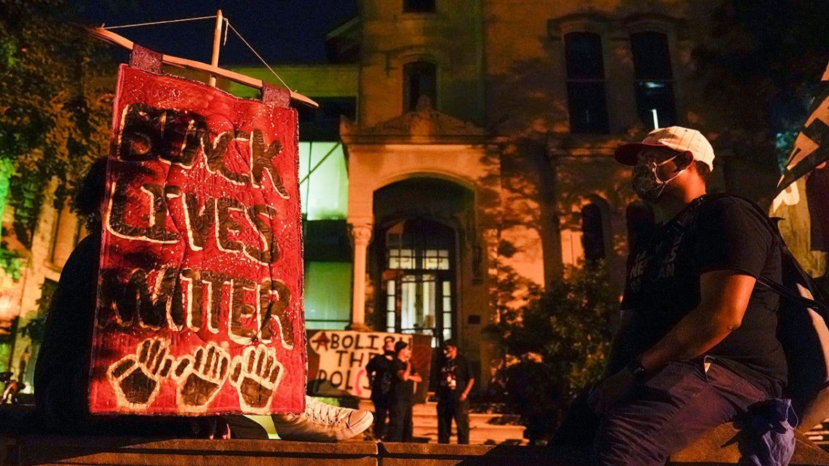 Protesters spend time on the grounds of a church in Louisville, Friday, September 25, 2020. (AP Photo/Daron Cummings)
