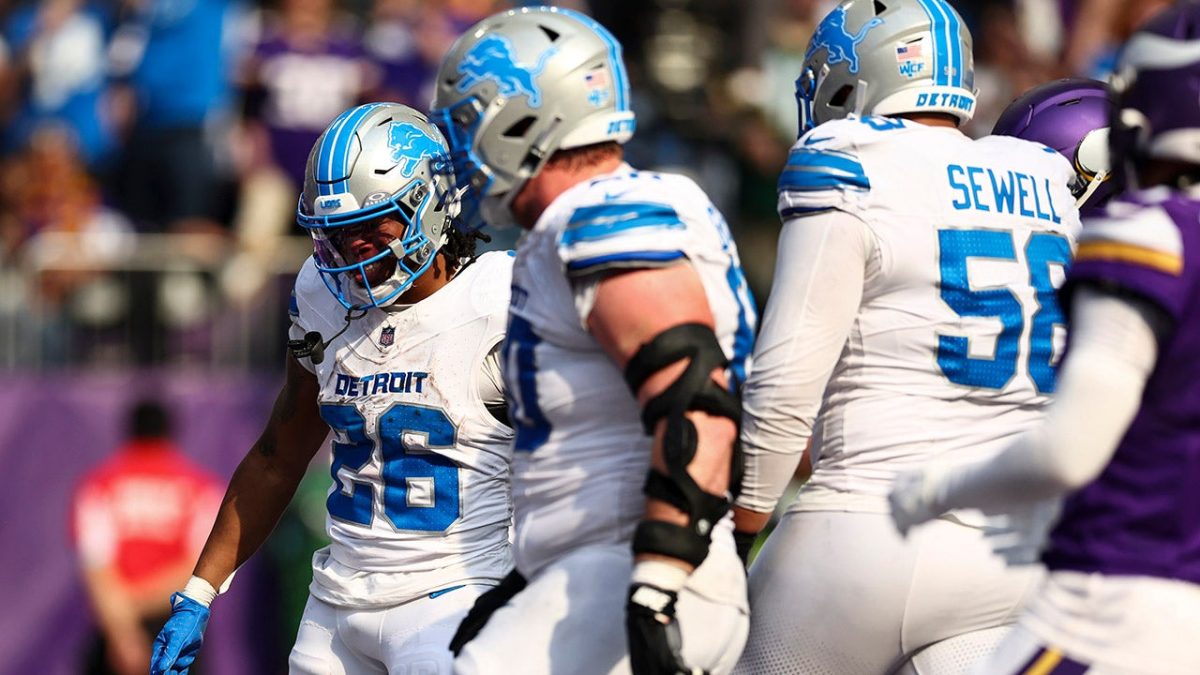 Jahmil Gibbs (left) of the Detroit Lions celebrates after scoring a touchdown against the Minnesota Vikings at U.S. Bank Stadium in Minneapolis on October 20, 2024. (Kevin Savitas/Getty Images)