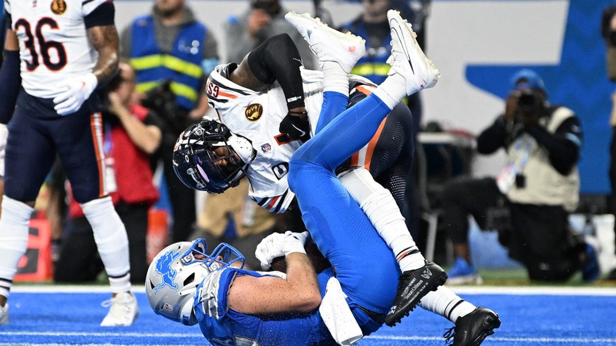 Detroit Lions tight end Sam LaPorta catches a touchdown pass during Thursday's game against the Chicago Bears at Ford Field in Detroit. (Ron Howedel Iman Images)