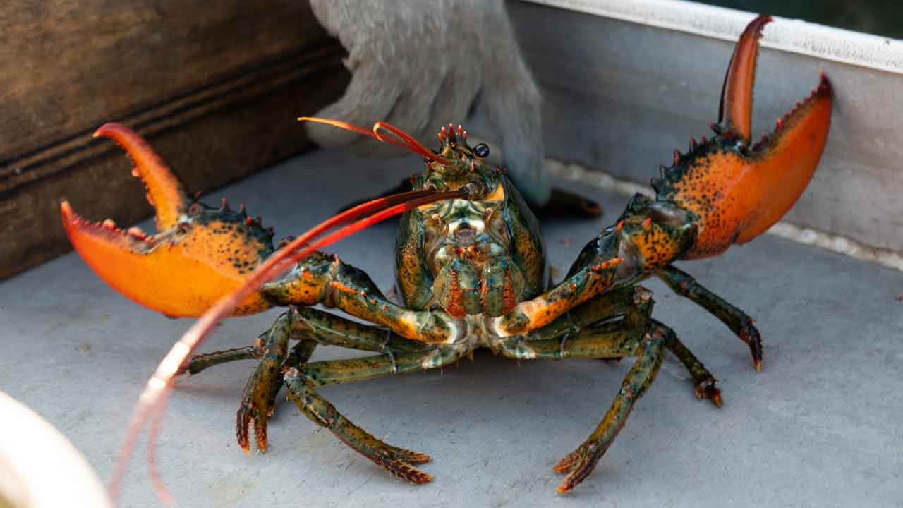 A lobster with its claws caught off Spruce Head, Maine, on August 31, 2021. (AP Photo/Robert F. Bucati, File)