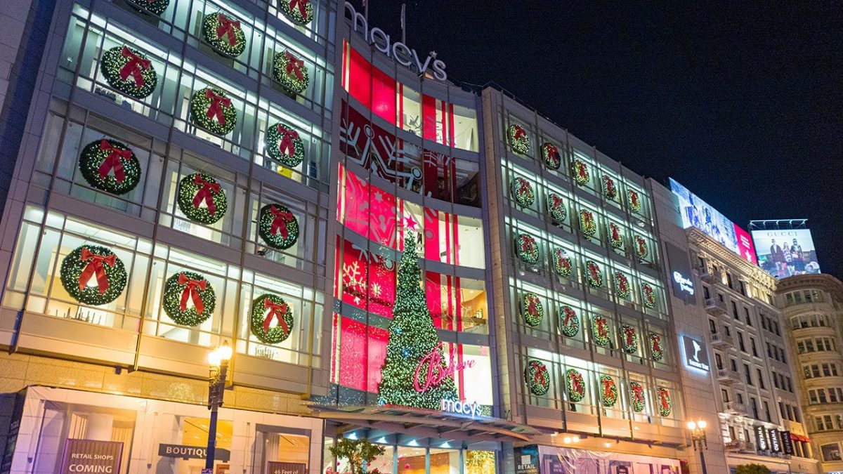 Night view of the brightly lit facade of the Macy’s department store flagship store in Union Square in San Francisco, California on Christmas Day, December 25, 2018. (The Smith Collection/Gado/Getty Images/Getty Images)