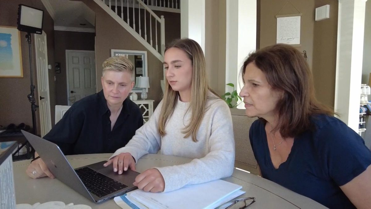 Stacey Hackenberg (left) and her partner Sharon Fleming (right) explore their long-term care options with help from Fleming’s daughter, Alexa Fleming (center).