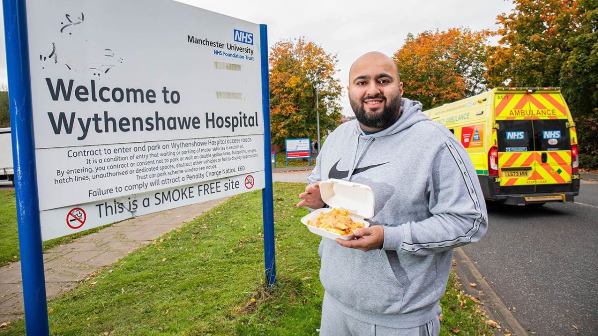 Omar Shafik was pictured outside Wythenshawe Hospital in Manchester with his favorite hospital dish – chips, beans and cheese. (SWNS)