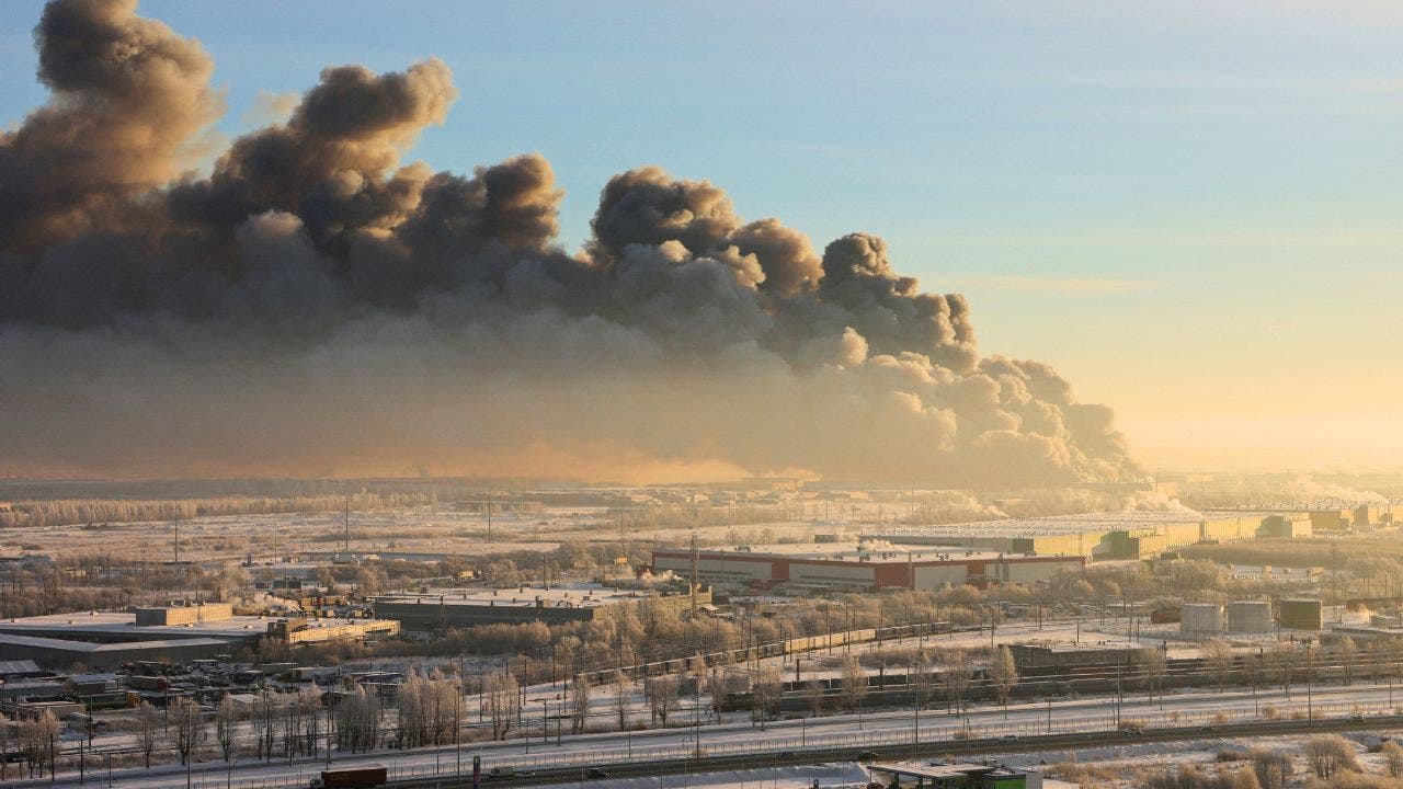 Black smoke billows from a burning warehouse in St. Petersburg, Russia, stretching for miles on January 13, 2024. (Reuters/Anton Vaganov)