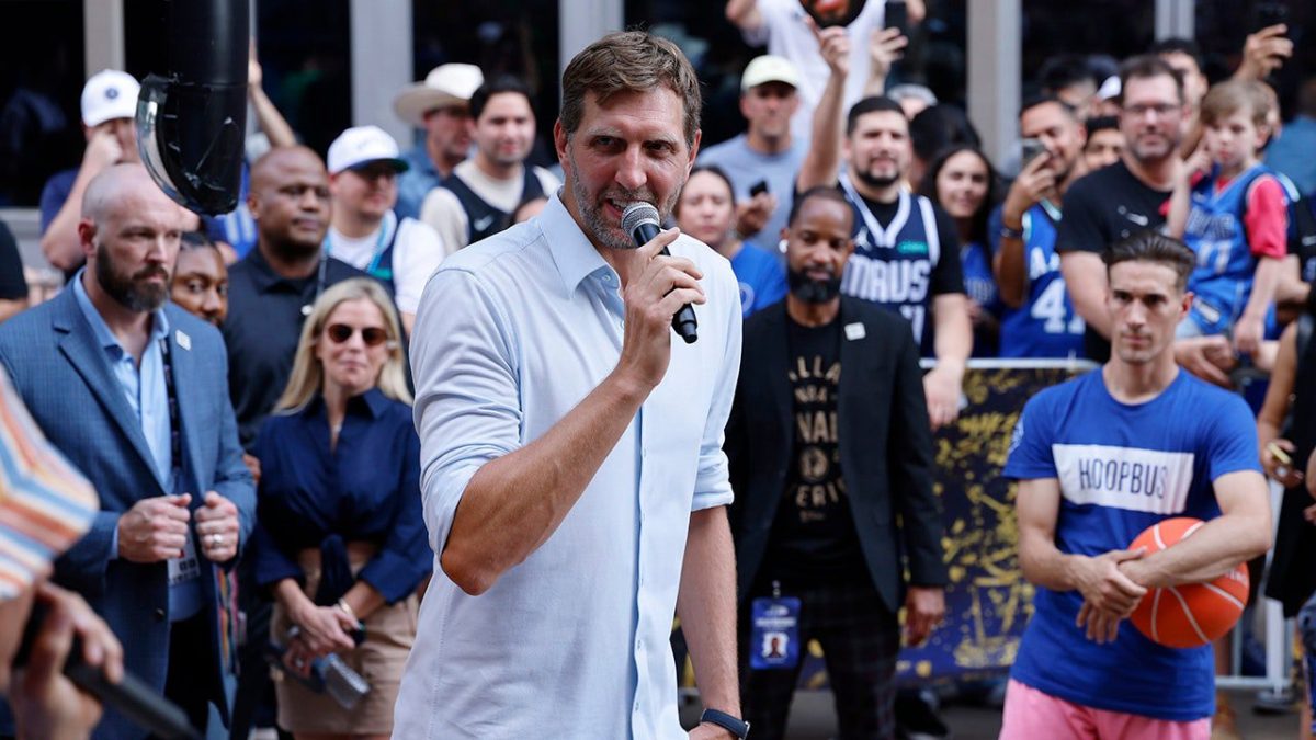 Dirk Nowitzki addresses the crowd
