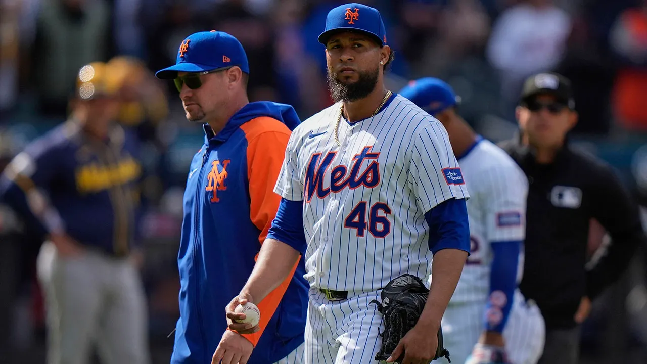 On Saturday, March 30, 2024, New York Mets relief pitcher Johan Ramirez (46 years old) was ejected during the seventh inning of the game against the Milwaukee Brewers in New York, and was left with manager Carlos Mendoza (left). gone. (AP Photo/Frank Franklin II)