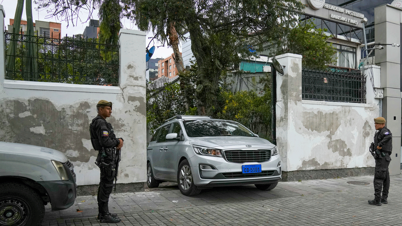 On Friday, April 5, 2024, a car with a diplomatic plate leaves the Mexican embassy in Quito, Ecuador. Ecuador on Thursday declared Mexico’s ambassador to Quito persona non grata following recent statements by Mexican President Andres Manuel López Obrador regarding the 2023 Ecuadorian presidential elections. (AP Photo/Dolores Ochoa)