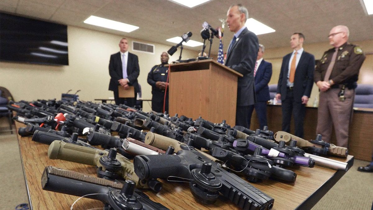 Law enforcement press conference with stolen firearms