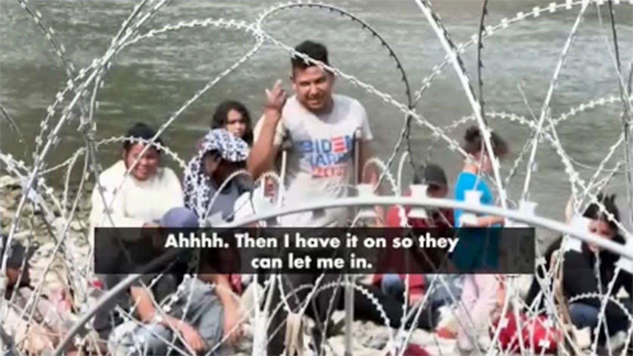 “Oh, yeah. Well, I’m wearing it so you can let me in,” the man replied with a laugh. Those around him also joined in the laughter. The two groups were separated by barbed wire, with what appeared to be the Rio Grande behind the migrants.