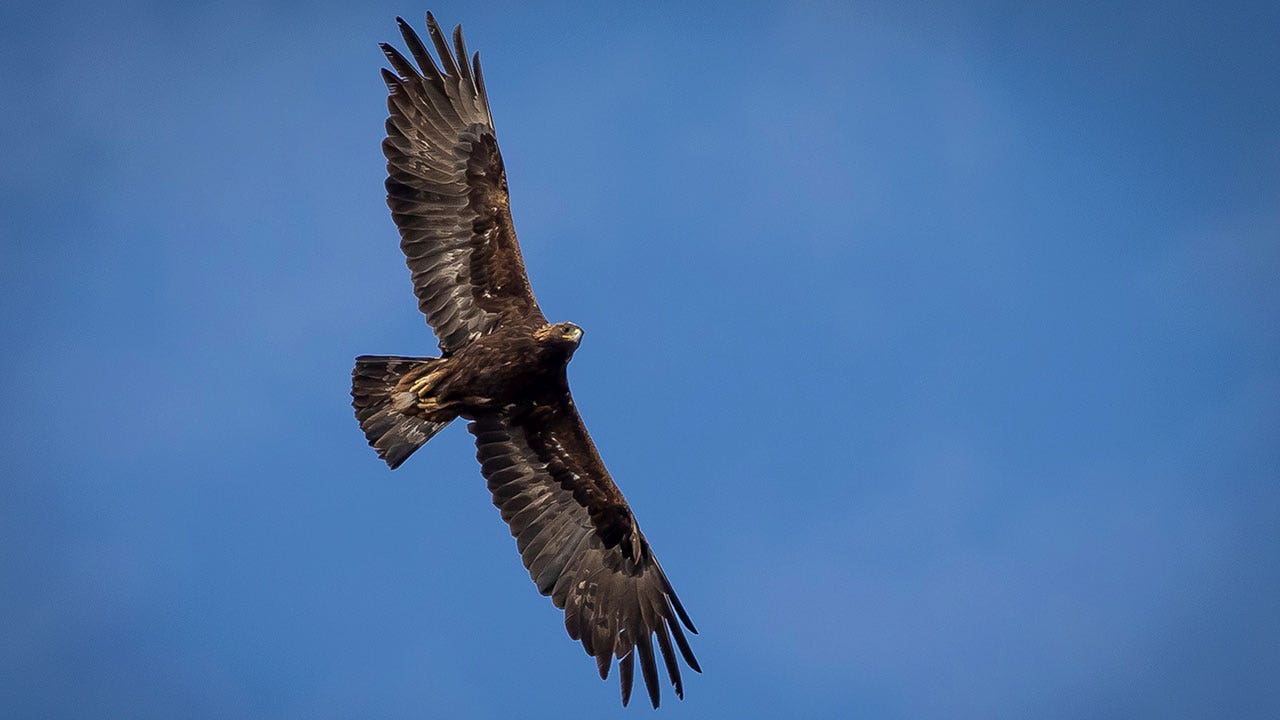 An adult golden eagle circles overhead in a remote area of Box Elder County, Utah, on May 20, 2021. Harvey Haggs, a Montana felon previously convicted of killing eagles to sell parts on the black market, was sentenced to three years in federal prison. He will be sentenced to prison on January 24, 2024 on gun control charges. (Spencer Heaps/Deseret News, via AP, File)