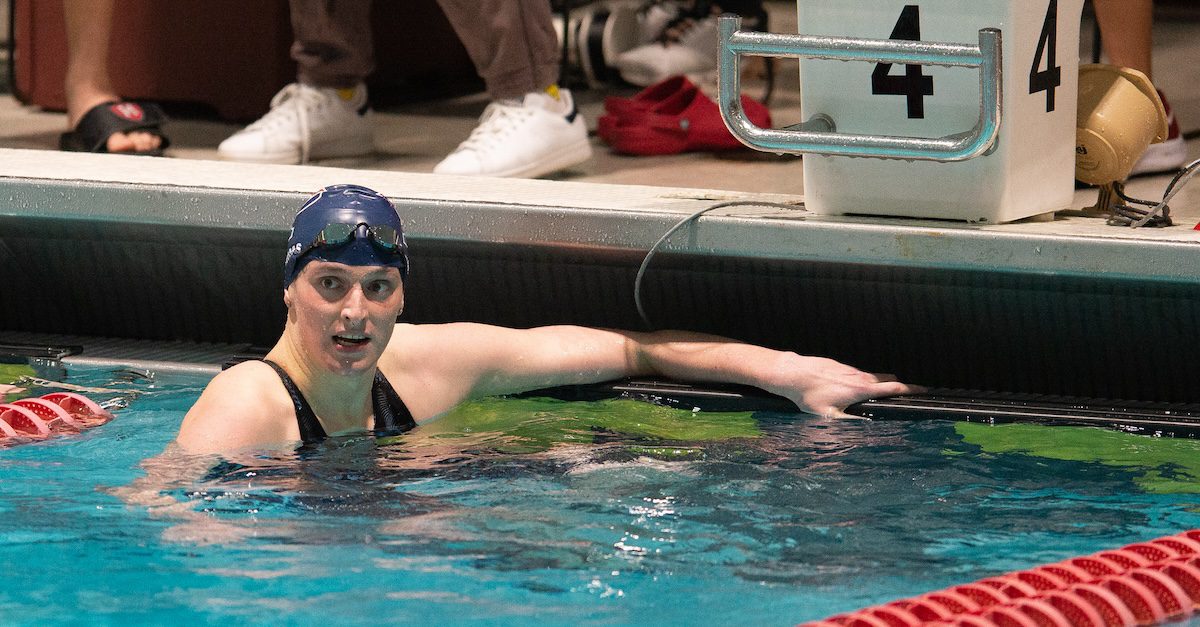 Photo Caption: CAMBRIDGE, MA – FEBRUARY 18: Winner of the 200-yard freestyle at the 2022 Ivy League Women’s Swimming and Diving Championships at Blodgett Pool on February 18, 2022 in Cambridge, Massachusetts. University of Pennsylvania swimmer Leah Thomas looks on.