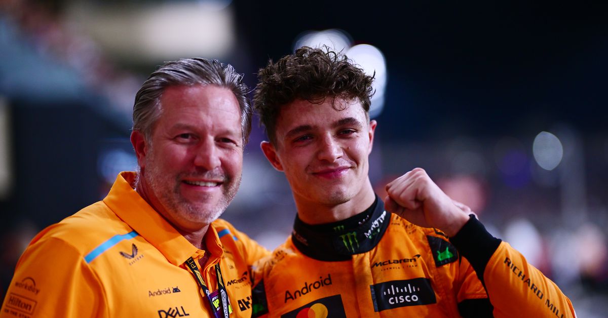 The poster is one of the main themes for the upcoming season, with an image of Formula 1 driver champion Max Verstappen looking at the rear view mirror in two fighting cars. One is a McLaren and the other is a Ferrari.