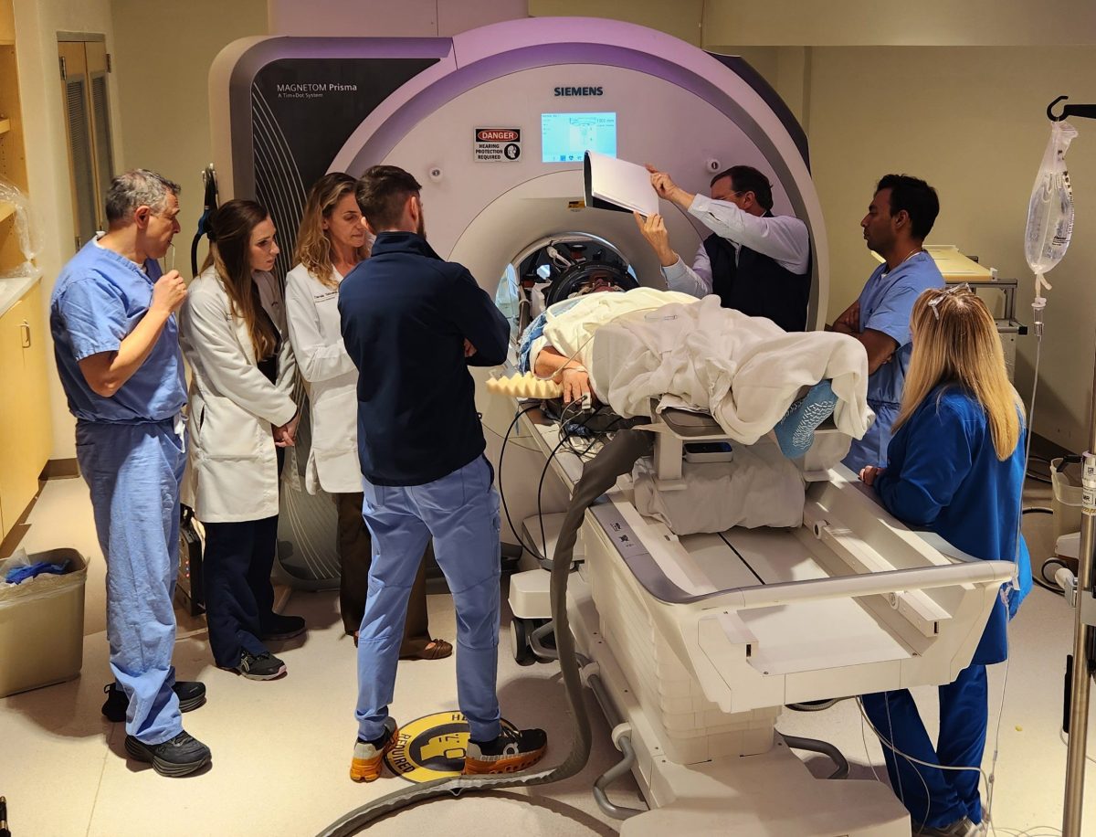 The WVU RNI team, shown in the control area of the MRI suite, plans an ultrasound blood-brain barrier treatment. (Rockefeller Neuroscience Institute (RNI) at West Virginia University (WVU))