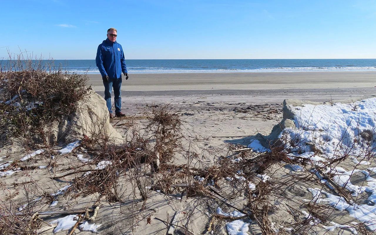 Mayor Patrick Rosenello stands next to a destroyed sand dune in North Wildwood, New Jersey, on January 22, 2024. (AP Photo/Wayne Parry)