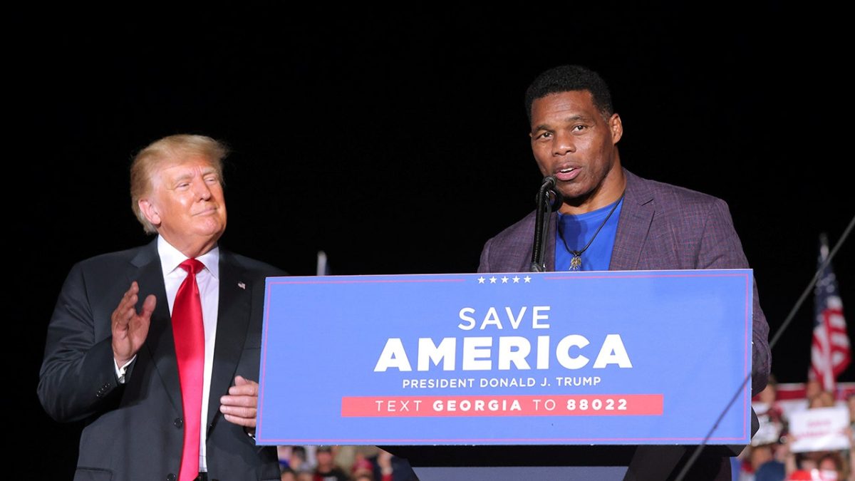 Former college football star Herschel Walker (right) speaks at a political rally as former President Donald Trump applauds on September 25, 2021 in Perry, Georgia. (Reuters/Dustin Chambers)