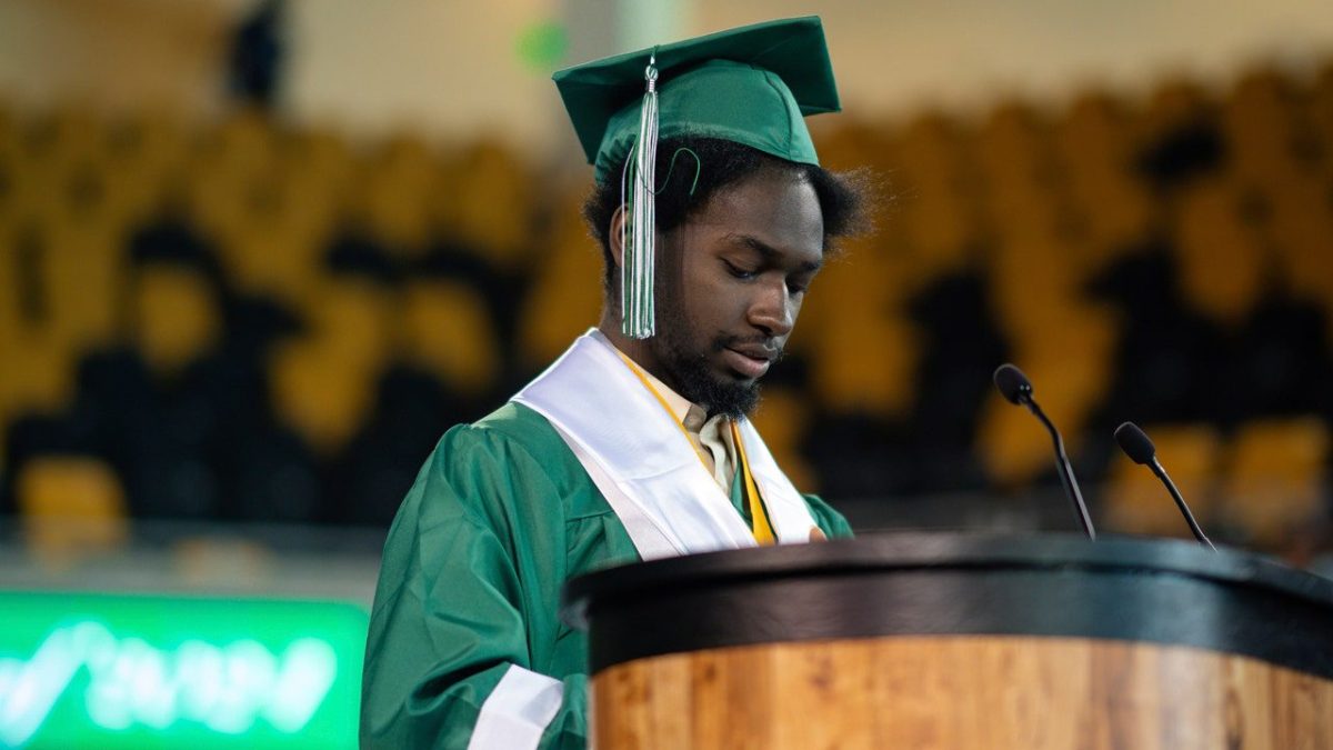 Elijah Hogan speaks at the Walter L. Cohen Charter High School graduation ceremony in New Orleans on May 24, 2024. Hogan graduated as one of two valedictorians from the charter high school. (Kewe Ukpolo via The Associated Press)