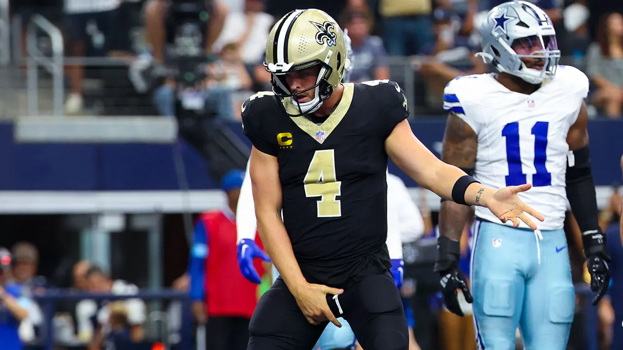 New Orleans Saints quarterback Derek Carr reacts after a touchdown during the second half of a game against the Dallas Cowboys at AT&T Stadium on September 15, 2024 in Arlington, Texas. (Kevin Jairaj-Imagine Images)